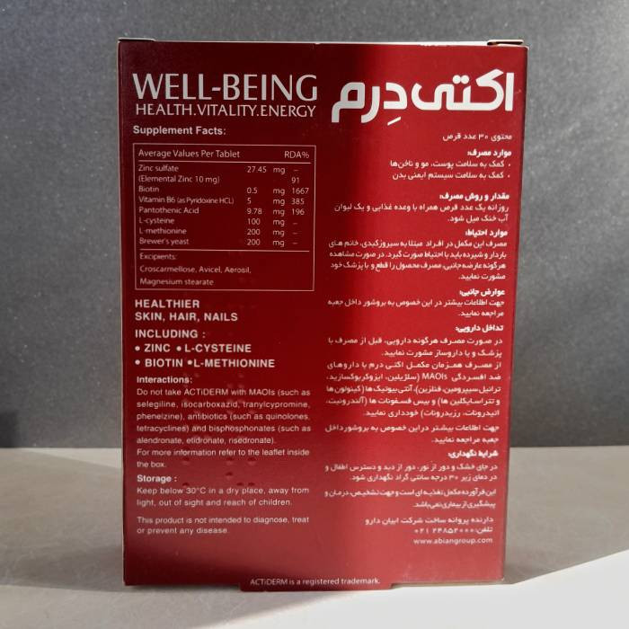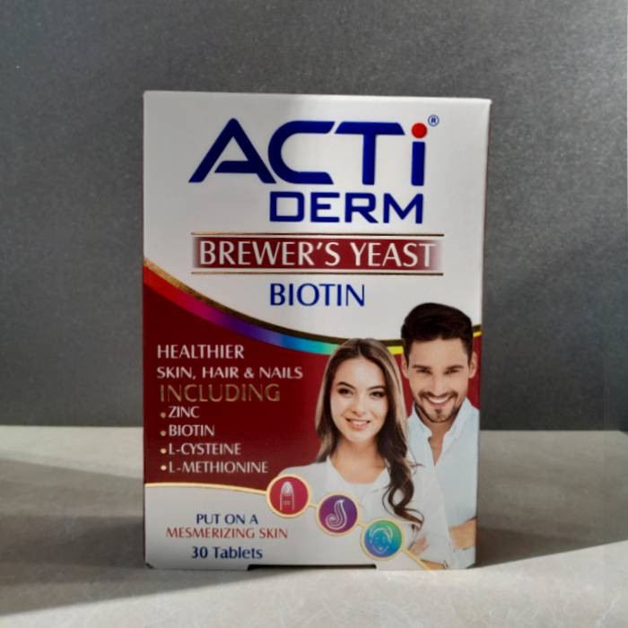اکتی درم یک مکمل تخصصی برای سلامت پوست،مو وناخن است این مکمل حاوی بیوتین (ویتامین ب 7 ) برای سلامت پوست،مو و جلوگیری از شکنندگی ناخن ها ، زینک برای کمک به تقویت فولیکول های مو و کاهش ریزش مو و ویتامین ب 6 و مخمر آبجو و امینو اسید های L – سیستئین و L – متیونین می باشد .