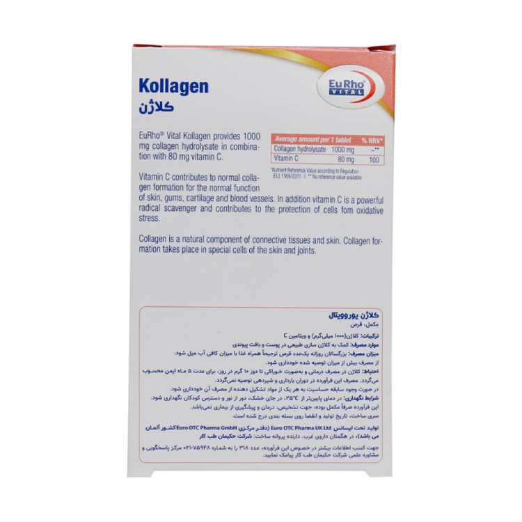 قرص کلاژن یوروویتال در جعبه مقوایی 30 عددی شامل 2 بلیستر 15تایی تحت امتیاز و لیسانس شرکت Euro OTC Pharma GmbH کشور آلمان تولید میشود. شرکت حکیمان طب کار دارنده پروانه ساخت کلاژن ۱۰۰۰ یوروویتال در ایران است.